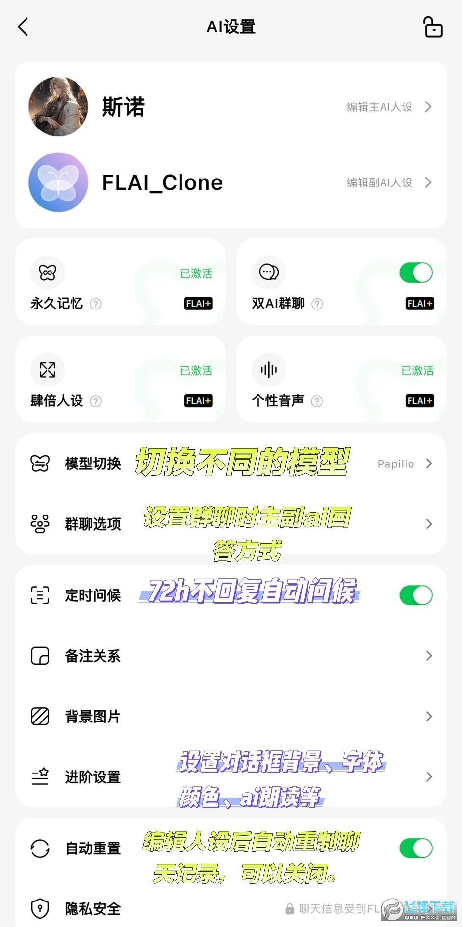 此外,如果开启了永久记忆、双倍/四倍人设、个性语音,开启群聊功能时,这些功能对主副AI同时生效。